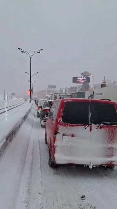 На МКАДе многокилометровая пробка от Строгино и до Химок — машины стоят без движения, пока трассу продолжает заметать снегом.
