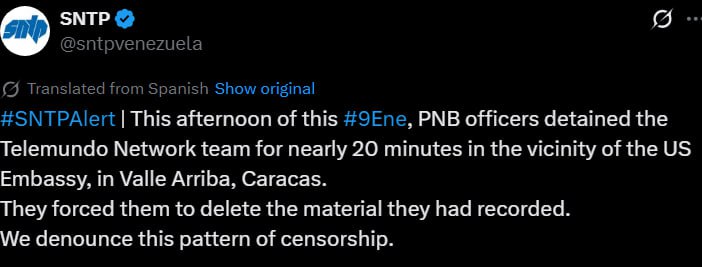 «Сегодня днём 9 января сотрудники PNB (Национальной боливарианской полиции) задержали команду телесети Telemundo почти на 20 минут в районе посольства США в Валле-Ариба, Каракас.