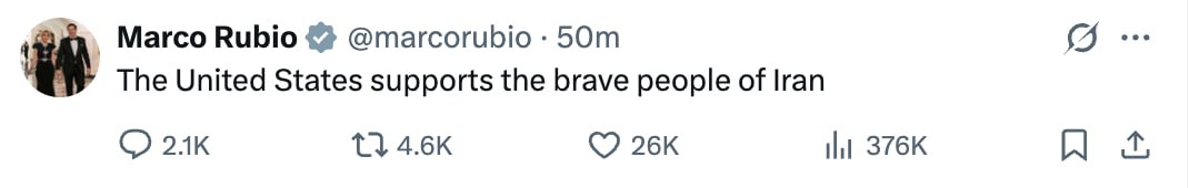 «Соединённые Штаты поддерживают храбрый народ Ирана», — написал в соцсети X госсекретарь США Рубио.