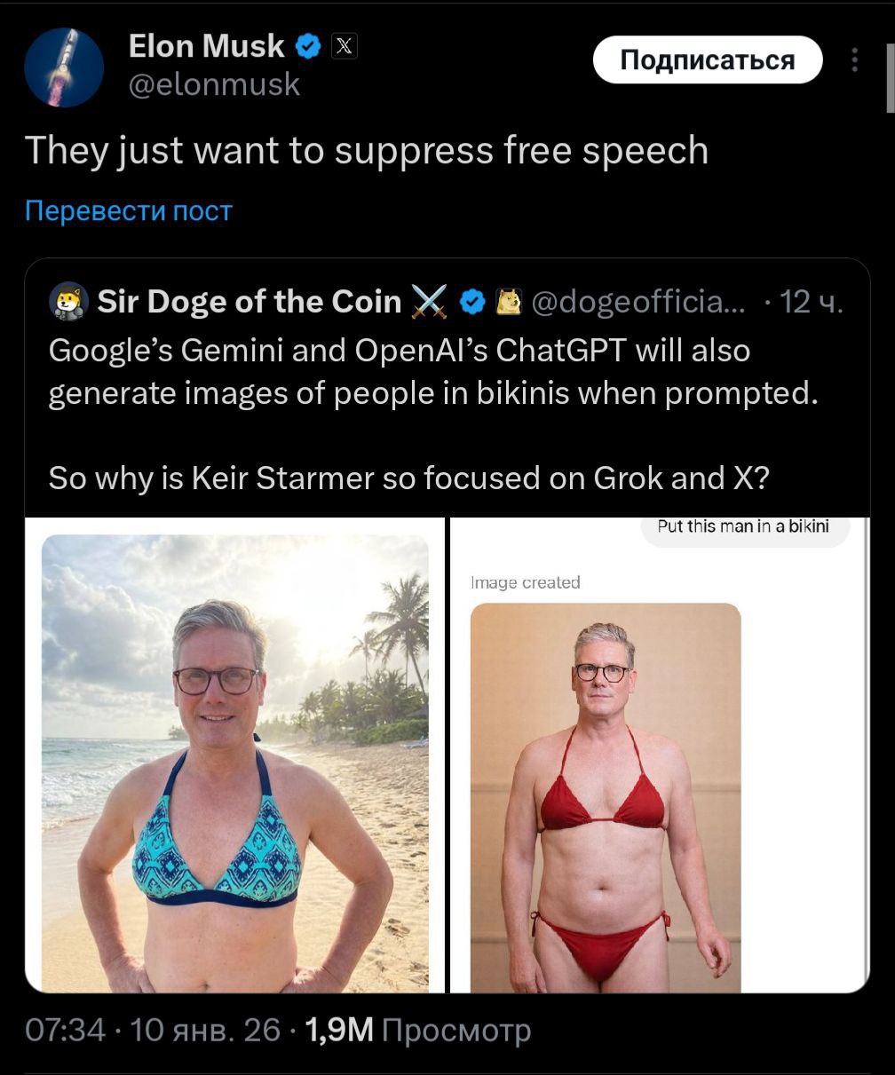 «Они просто хотят запретить свободу слова!» — написал Илон Маск, репостнув изображение британского премьера Кира Стармера в бикини.