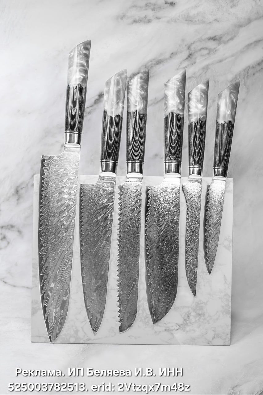 Кухонные ножи из Широгами дамасска. Серия включает 5 ножей, которые закрывают все задачи по кухне!