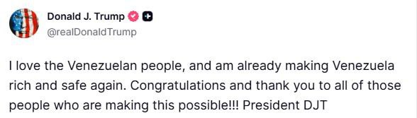 Дональд Трамп заявил в Truth Social, о том что он делает Венесуэлу богатой и безопасной: