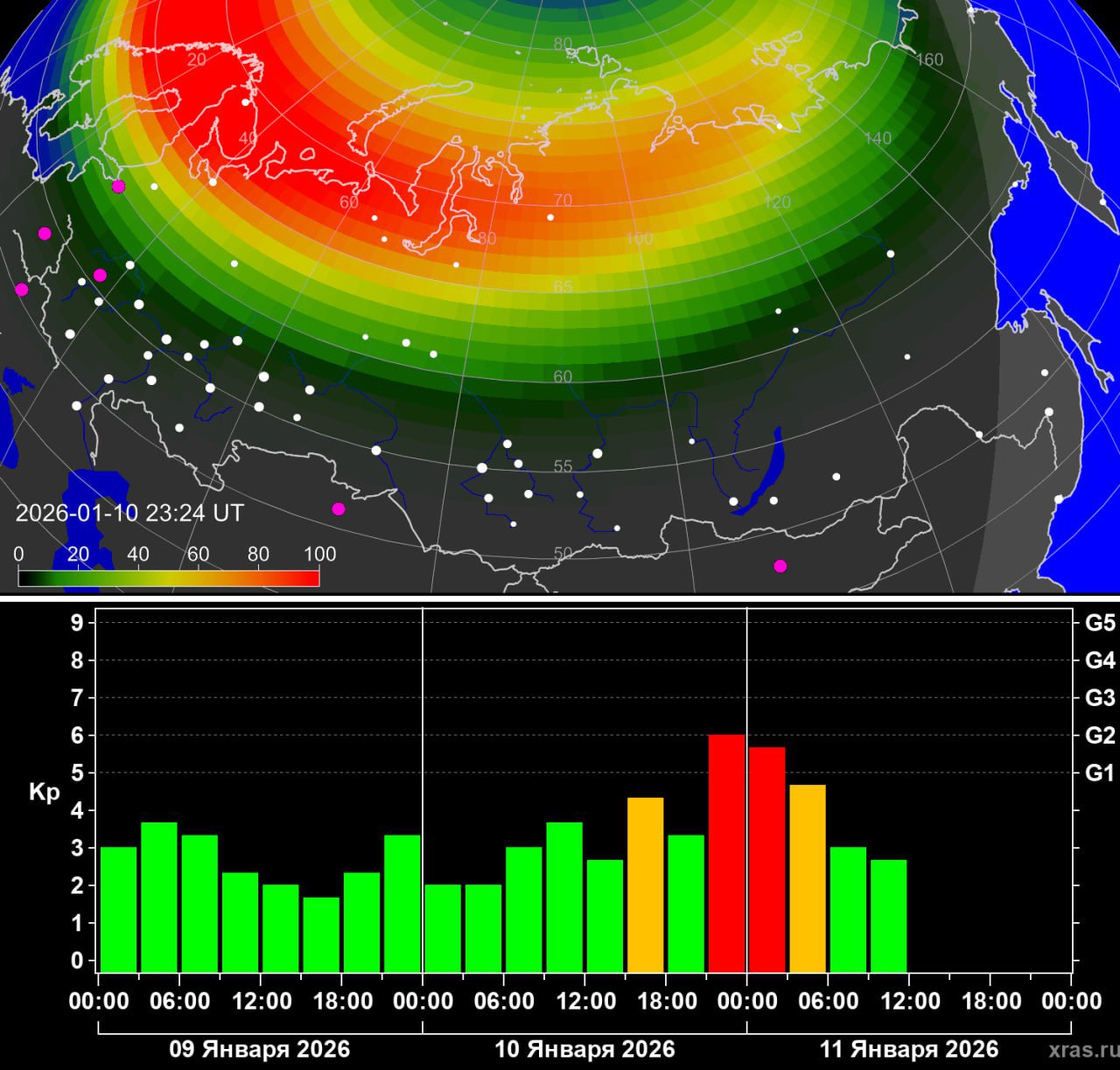 Магнитная буря, сопровождавшаяся сильными полярными сияниями, произошла ночью в воскресенье.