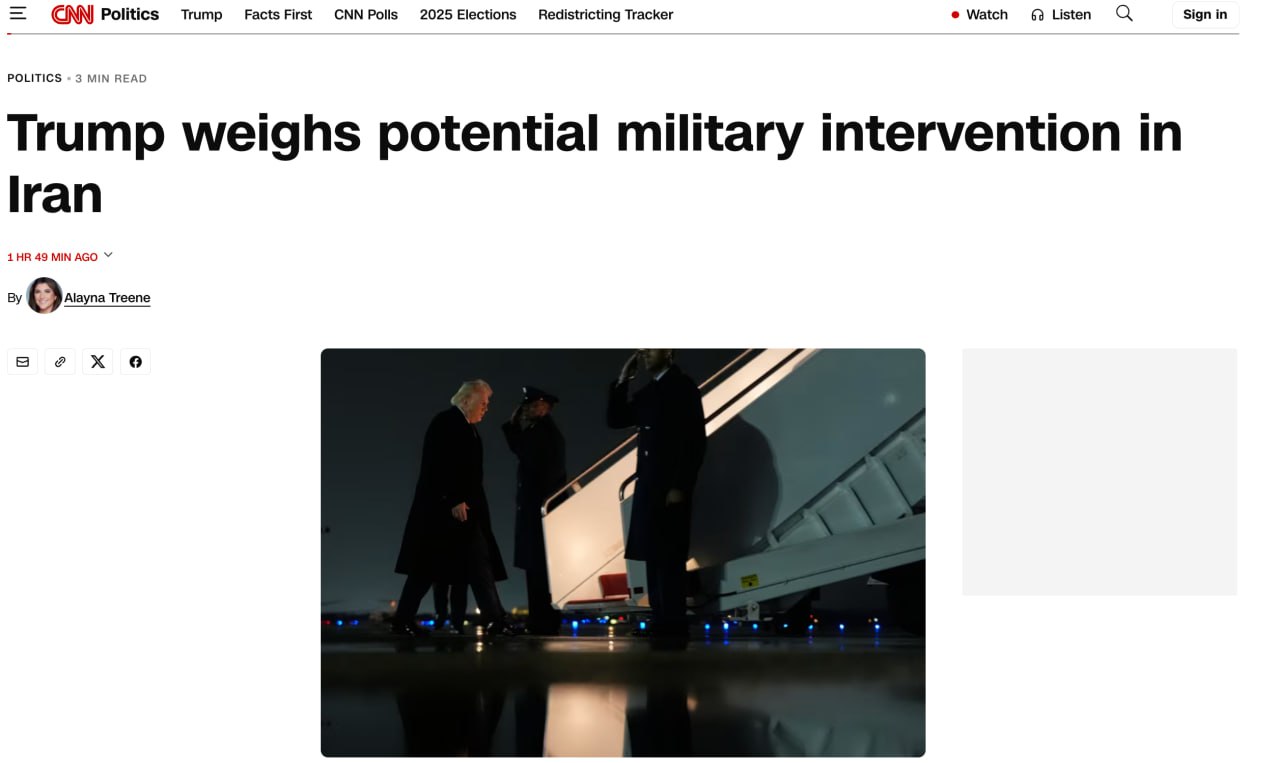 По их словам, Трамп в последние дни получал брифинги по различным сценариям — от точечных ударов по структурам безопасности в Тегеране до мер, не предполагающих прямого применения американской армии. Речь идёт прежде всего о возможных ударах по силовым ведомствам, задействованным в подавлении протестов.