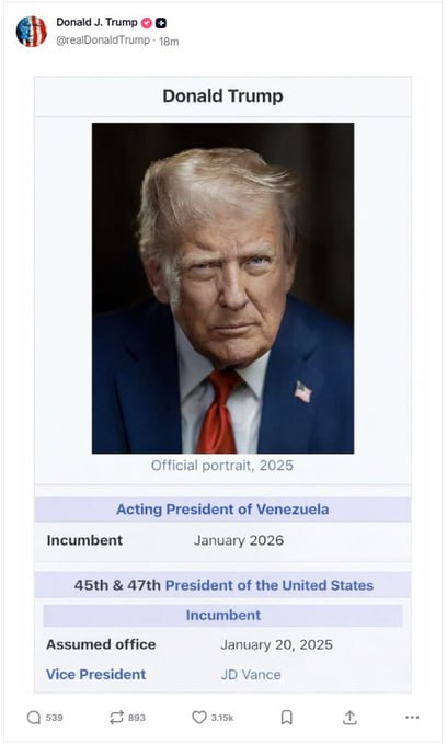 Мемный "скриншот" из Википедии с такой информацией Трамп опубликовал в соцсети Truth Social.На шуточном скриншоте изображена якобы страница Дональда Трампа со знаменитого сайта-энциклопедии, где он обозначен исполняющим обязанности лидера Венесуэлы....