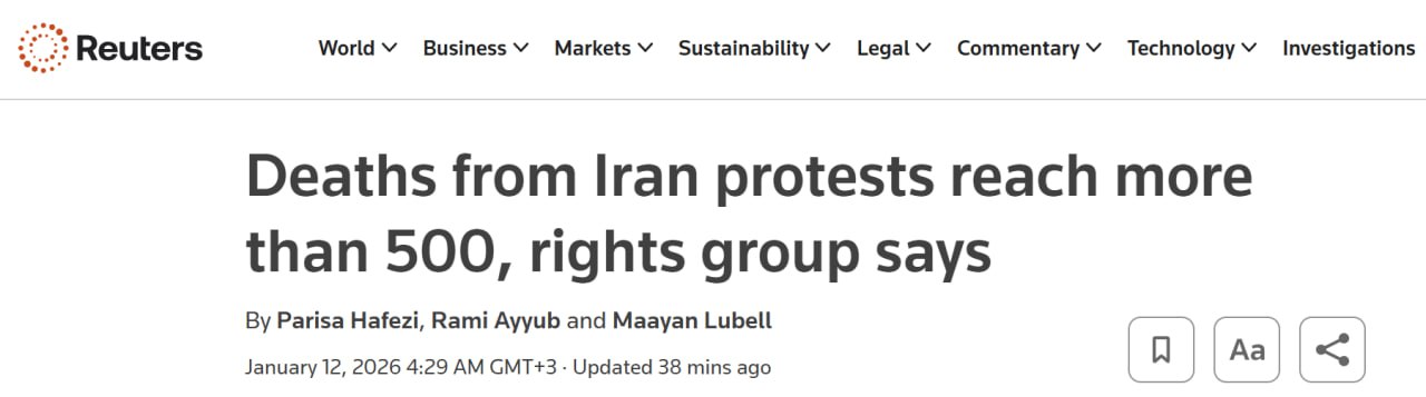 Reuters, со ссылкой на правозащитную организацию HRANA , сообщает, что число погибших в ходе протестов в Иране превысило 500 человек.