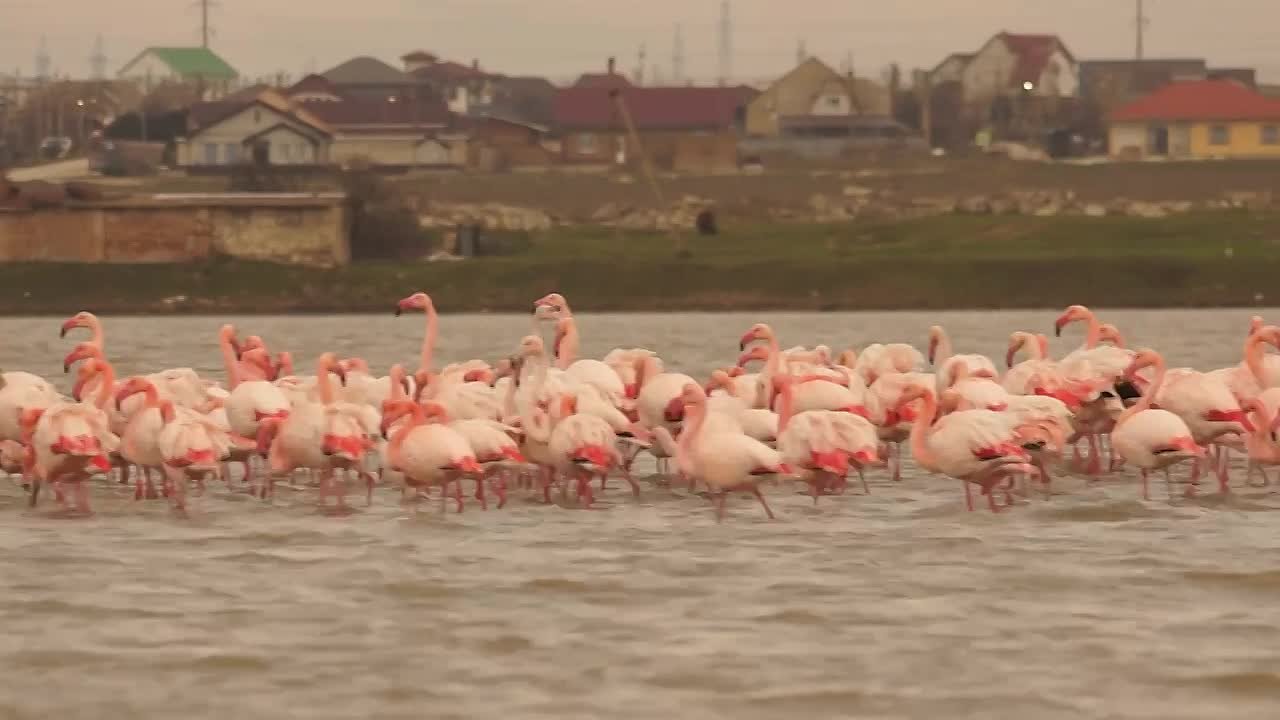 Крупная колония фламинго прилетела к озеру у крымской Феодосии.