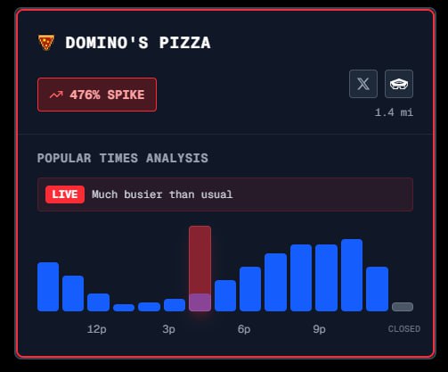 Резкий всплеск "индекса пиццы" зафиксирован в районе Пентагона — в отдельные моменты рост заказов в близлежащих пиццериях достигал 476%.