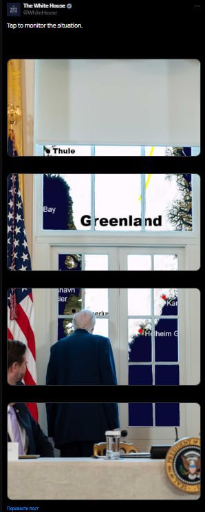 "Нажмите, чтобы следить за ситуацией": пост с такой надписью появился на странице Белого дома в соцсети Х после внесения в американский конгресс законопроекта об "аннексии Гренландии и предоставлении статуса штата".