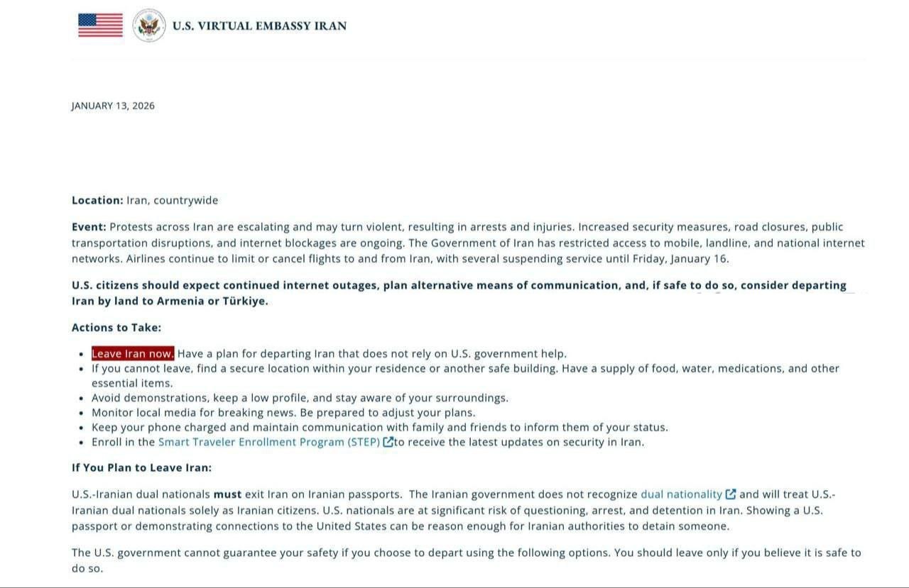 Виртуальное посольство США в Иране также призывает американских граждан немедленно покинуть Иран. Ранее к этому призвал Госдеп США.
