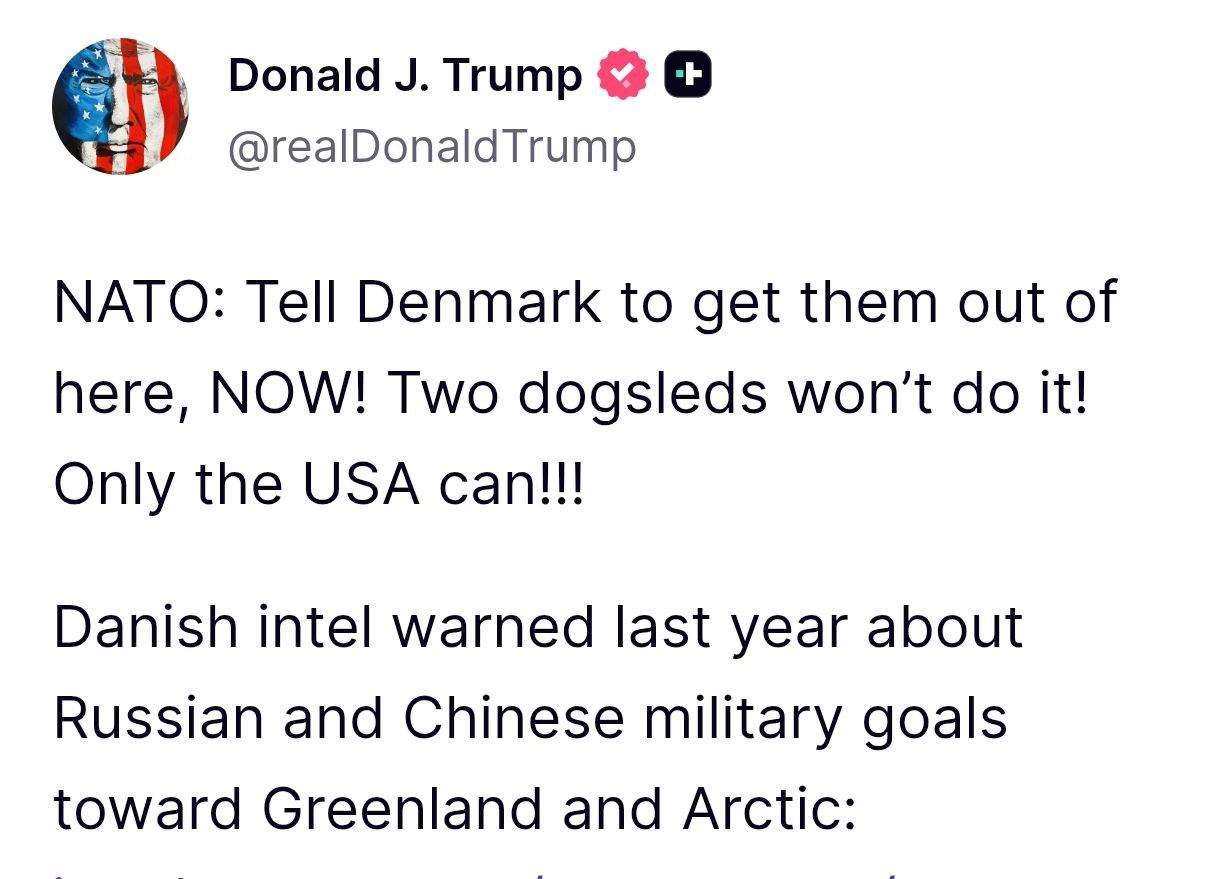 НАТО: Скажите Дании, чтобы они НЕМЕДЛЕННО убрались отсюда! Двух собачьих упряжек недостаточно! Только США могут это сделать!!!