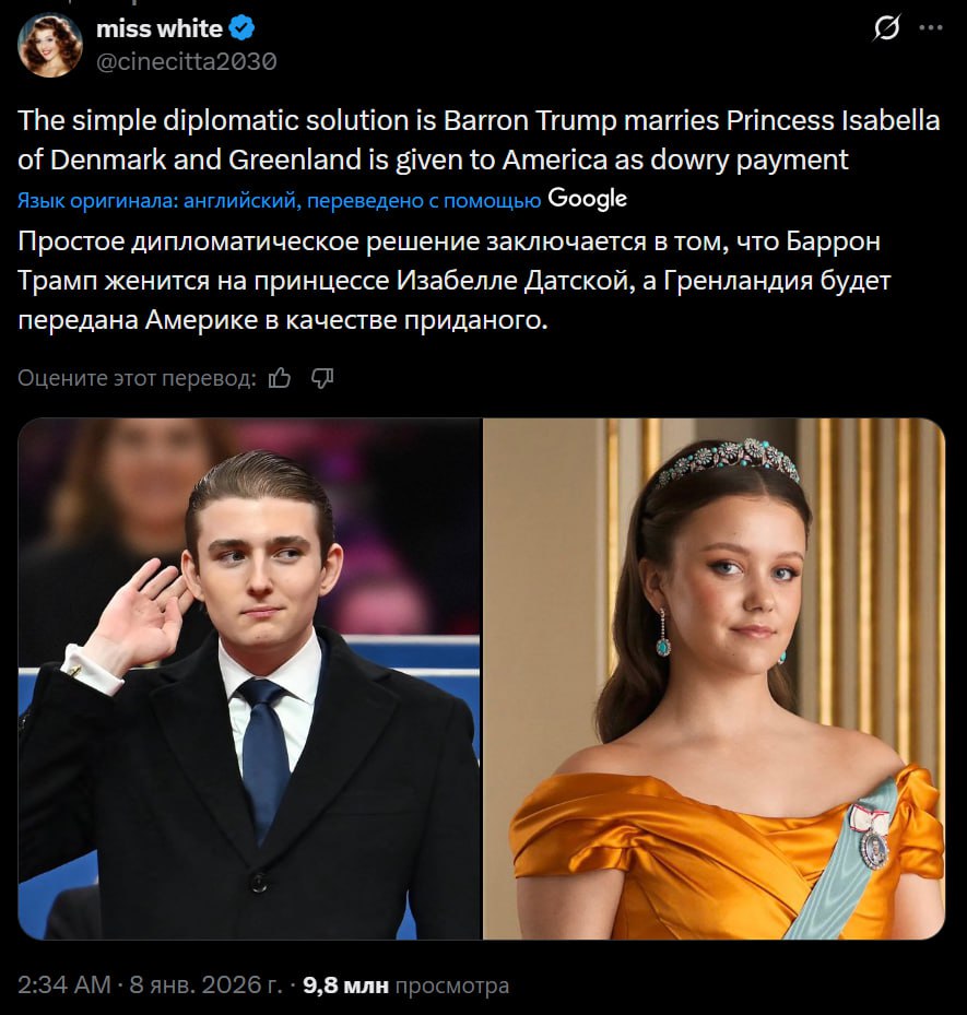 «Баррон Трамп женится на принцессе Изабелле Датской, а Гренландия будет передана Америке в качестве приданого», — пользователи X предлагают простое решение по передаче острова США.