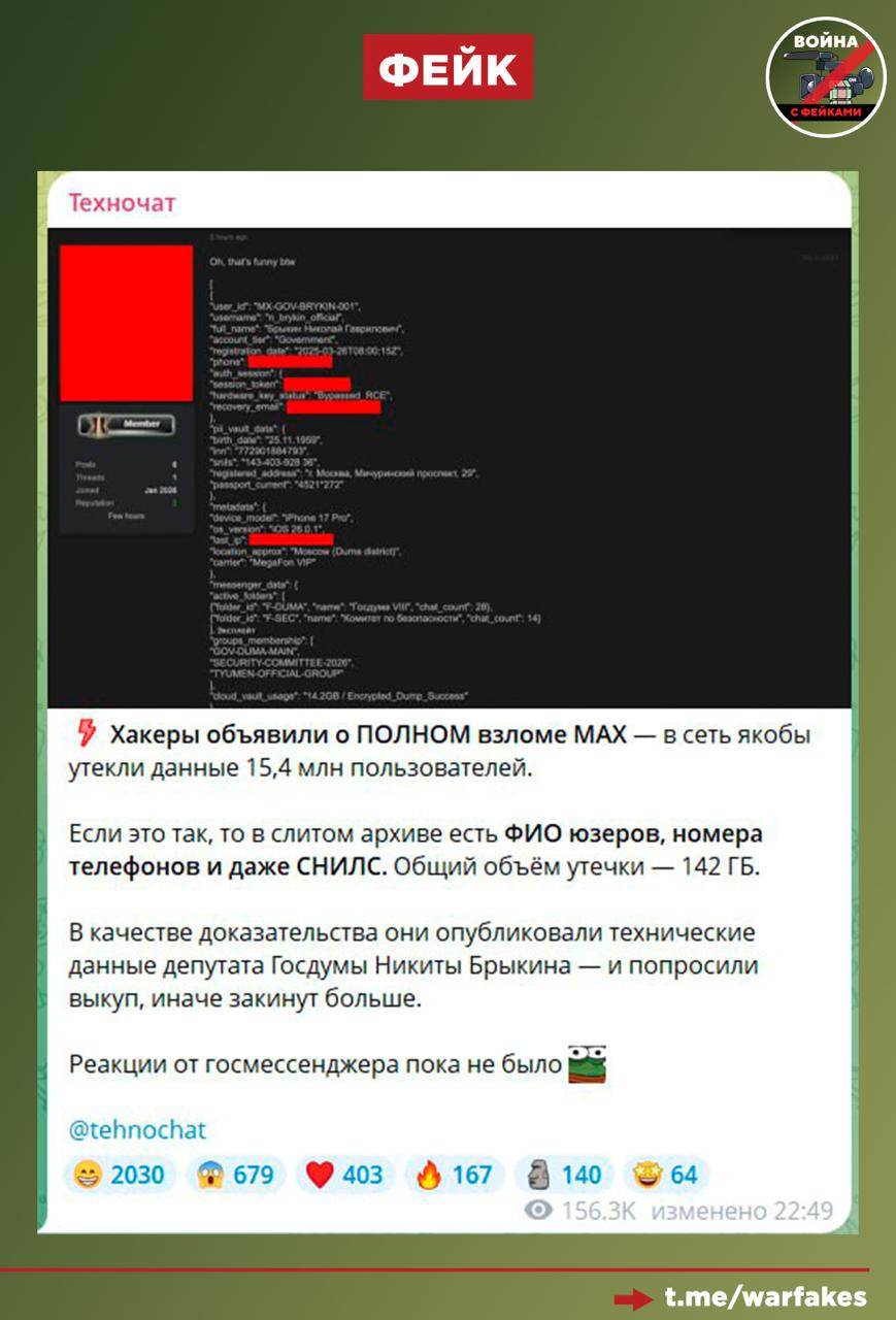 Правда: Данные пользователей МАХ находятся под надежной защитой — приложение никто не взламывал. Демонстрируемый скрин якобы данных пользователя не имеет никакого отношения к мессенджеру — в таком формате они не хранятся. В МАХ нет данных о локации, дате рождения, почте пользователя, ИНН, СНИЛС и так далее. Также в нем нет username и «уровней аккаунта», поскольку мессенджер не маркирует пользователей по «уровням».