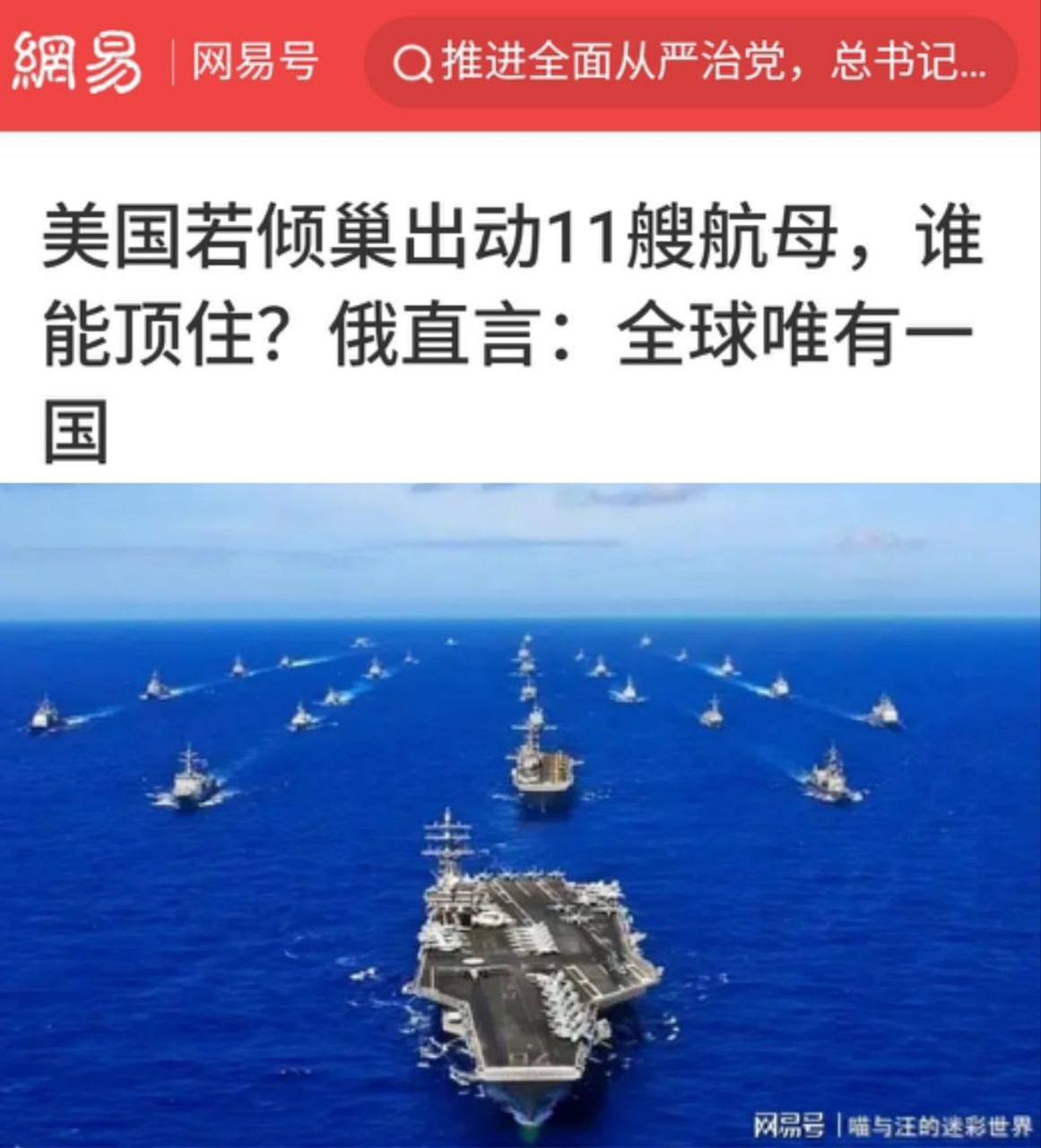 «Военные эксперты заявили, что в мире есть только одна страна, которая может противостоять всем 11 авианосным ударным группам ВМС США, и это Россия. При одновременном задействовании 11 авианосцев под контролем окажутся основные мировые акватории, и почти половина земного шара окажется в радиусе поражения. Почему России хватает смелости заявлять, что она сможет сдержать этот натиск?