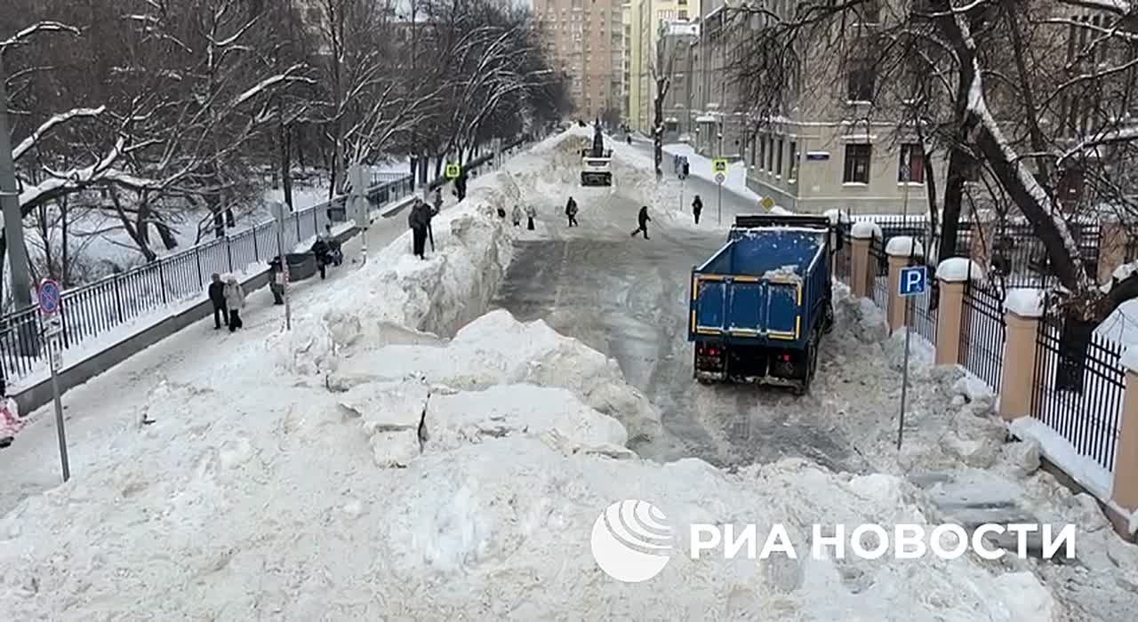 Снежную гору на Миусской улице в Москве убирают - этим занимаются городские службы