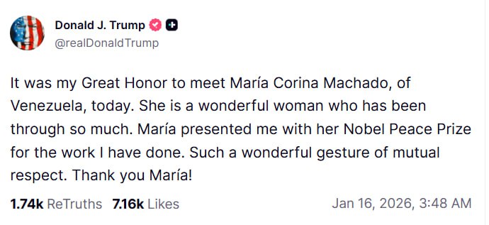 «Для меня было большой честью встретиться сегодня с Марией Кориной Мачадо из Венесуэлы. Она замечательная женщина, которая прошла через многое. Мария вручила мне свою Нобелевскую премию мира за работу, которую я проделал. Какой замечательный жест взаимного уважения. Спасибо, Мария!»