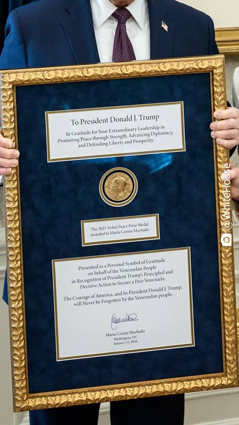 Трамп получил медаль Нобелевской премии мира — её вручила Трампу лидер венесуэльской оппозиции Мария Корина Мачадо.