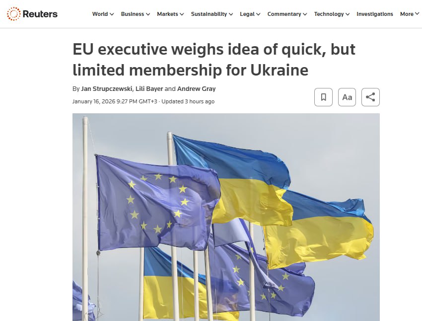 Reuters: Еврокомиссия рассматривает предложение о том, чтобы позволить Украине быстро присоединиться к ЕС в рамках будущего мирного соглашения с Россией, но без полных прав членства на первом этапе.