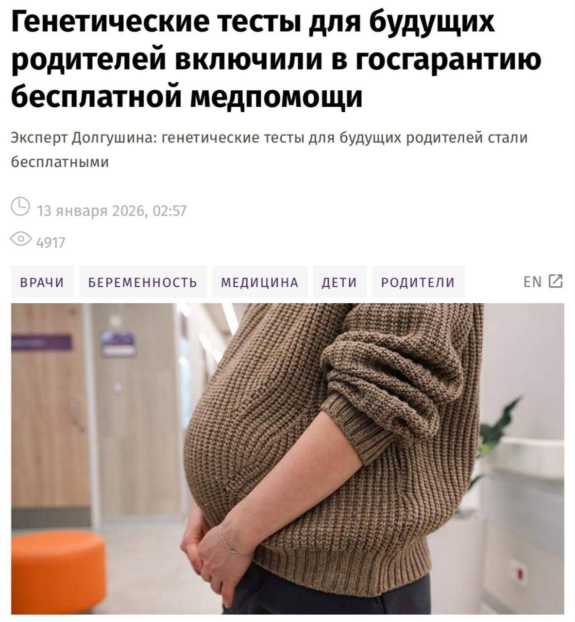 Генетические тесты для будущих родителей с этого года стали бесплатными в России, сообщили в Минздраве. Они помогают избежать осложнений при беременности и заранее понять, есть ли у ребёнка риск тяжело заболеть — например, муковисцидозом или спинальной мышечной атрофией.