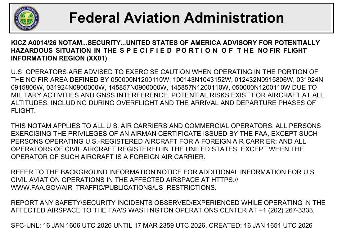 FAA выпустило уведомления NOTAM для рейсов над Мексикой, странами Центральной Америки, а также Эквадором, Колумбией и частью воздушного пространства над восточной частью Тихого океана. Эти предупреждения действуют минимум 60 дней изза рисков, связанных с потенциальной военной деятельностью и помехами навигации.