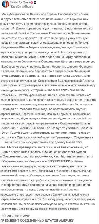На протяжении многих лет мы фактически субсидировали Данию, а также все страны ЕС и ряд других государств, не взимая с них тарифы или иные формы компенсации. Теперь, спустя столетия, настало время Дании вернуть долг — на кону стоит мир в мире. Китай и...