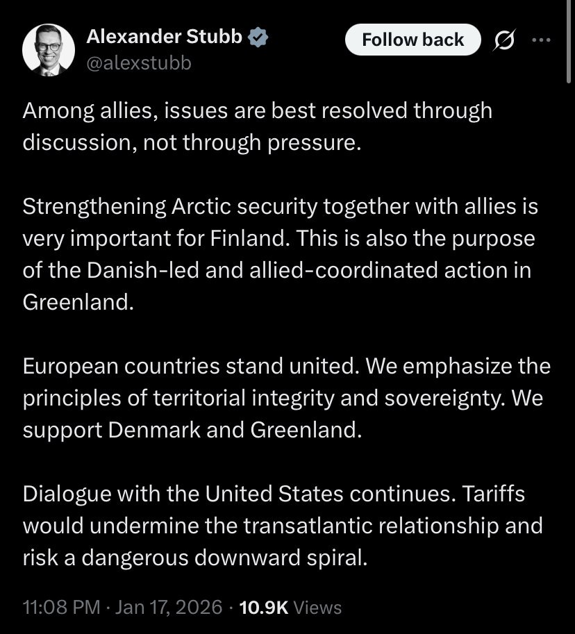 «Введение пошлин подорвет трансатлантические отношения и создаст риск опасной нисходящей спирали», – президент Финляндии Александр Стубб, реагируя на «тарифный шантаж» Трампа, скопировал тезис Урсулы фон дер Ляйен.