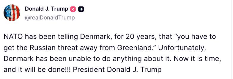 На протяжении 20 лет НАТО говорило Дании: «Вы должны устранить российскую угрозу для Гренландии». К сожалению, Дания не могла ничего с этим поделать. Но теперь пришло время, и это будет сделано! (c) Дональд Трамп
