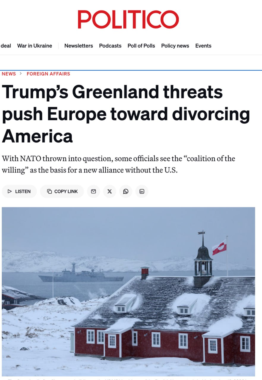 Politico делает вывод, что на фоне угроз Трампа по Гренландии и растущего сомнения в надёжности США как союзника, именно этот неформальный формат может со временем лечь в основу новой европейской архитектуры безопасности — уже без автоматической опоры на Вашингтон.