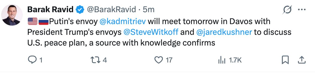 Журналист Axios Барак Равид заявил, что в Давосе спецпредставитель президента России Кирилл Дмитриев встретится с Уиткоффом и Кушнером.