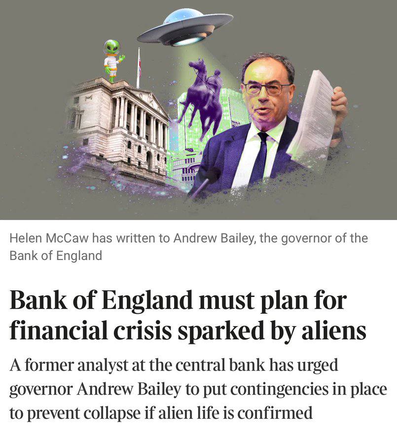 Банку Англии предлагают готовиться к кризису из-за инопланетян, о существовании которых может объявить Трамп.