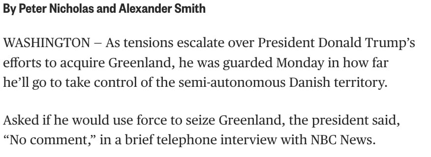 «Отвечая на вопрос, готов ли он применить силу для захвата Гренландии, президент в кратком телефонном разговоре с NBC News заявил: „Без комментариев“».