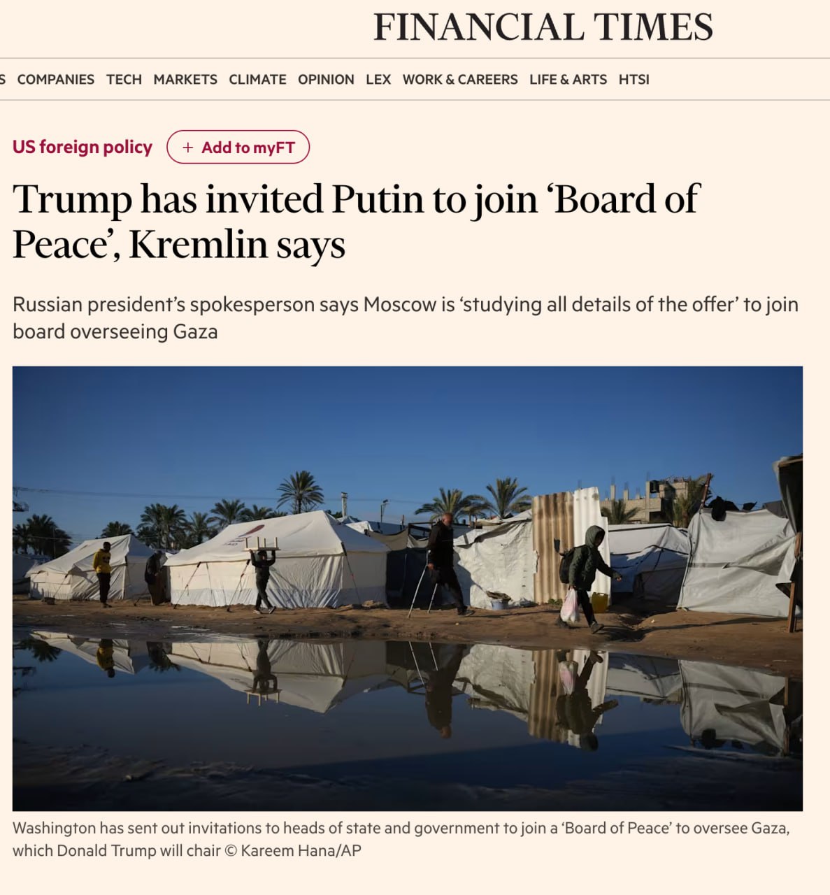 Financial Times пишет, что предложение Дональда Трампа к Владимира Путину войти в число учредителей «Совета мира» по Газе и другим геополитическим конфликтным зонам является сигналом того, что президент США стремится сохранить тёплые отношения с президентом России.