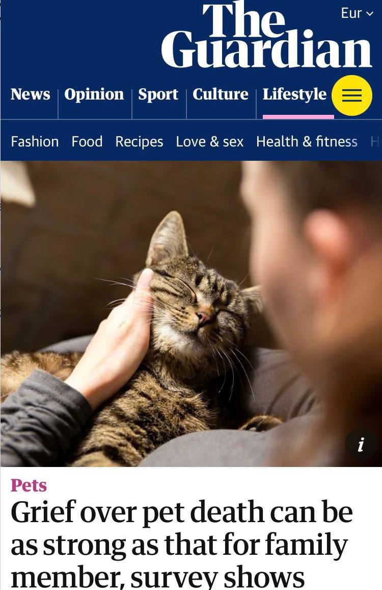 «Скорбь по умершему питомцу может быть такой же тяжёлой и длительной, как по потере близкого человека, показало исследование. Учёные опросили почти тысячу взрослых британцев и выяснили, что симптомы 7,5 % людей после смерти питомца соответствуют критериям «затяжного горя» - это сопоставимо с горем после смерти друга или бабушки/дедушки и лишь немного уступает утрате брата/сестры или партнёра.