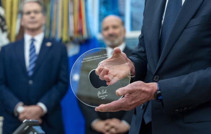 Также в августе 2025 года глава Apple Тим Кук порадовал президента США стеклянным диском на основании, выполненном из 24-каратного золота, в благодарность за инвестиции. Вскоре после этого компания потеряла около $2 млрд из-за введенных Трампом пошлин, которые повлияли на стоимость товаров из Индии.