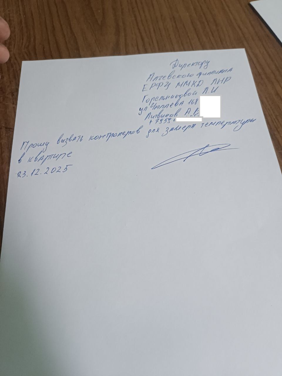 Доброе утро, Алчевск беспокоит. Вот термометр в спальне показывает 9+. В школе проблемы с отоплением и дети остались дома на дистанте. Два обогревателя включены и день и ночь. 2300 за отопление, которого нет. А фото №1 - это заявление в ЖЭК, на которое никто до сих пор не отреагировал.