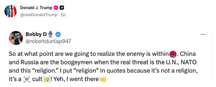 Дональд Трамп в Truth Social репостнул сообщение о том, что настоящая угроза для США - это ООН и НАТО, а не Китай и Россия: