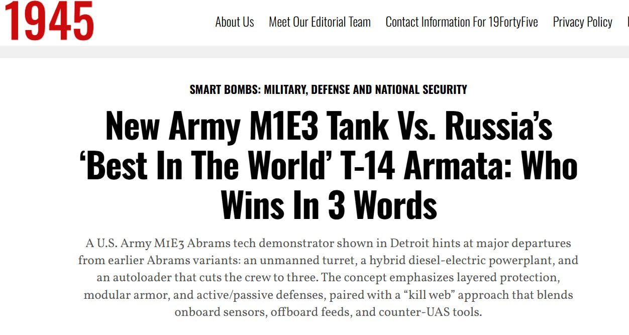 США заявляют, что их перспективный танк M1E3 Abrams сможет противостоять российской «Армате». Но есть одно «но»: на сегодняшний день это лишь концепт и демонстратор технологий. Эксперты, проанализировавшие характеристики, уверены: даже если бы новый «Абрамс» уже был построен, в гипотетическом столкновении его шансы против готовой, технологически завершённой Т-14 были бы невелики.