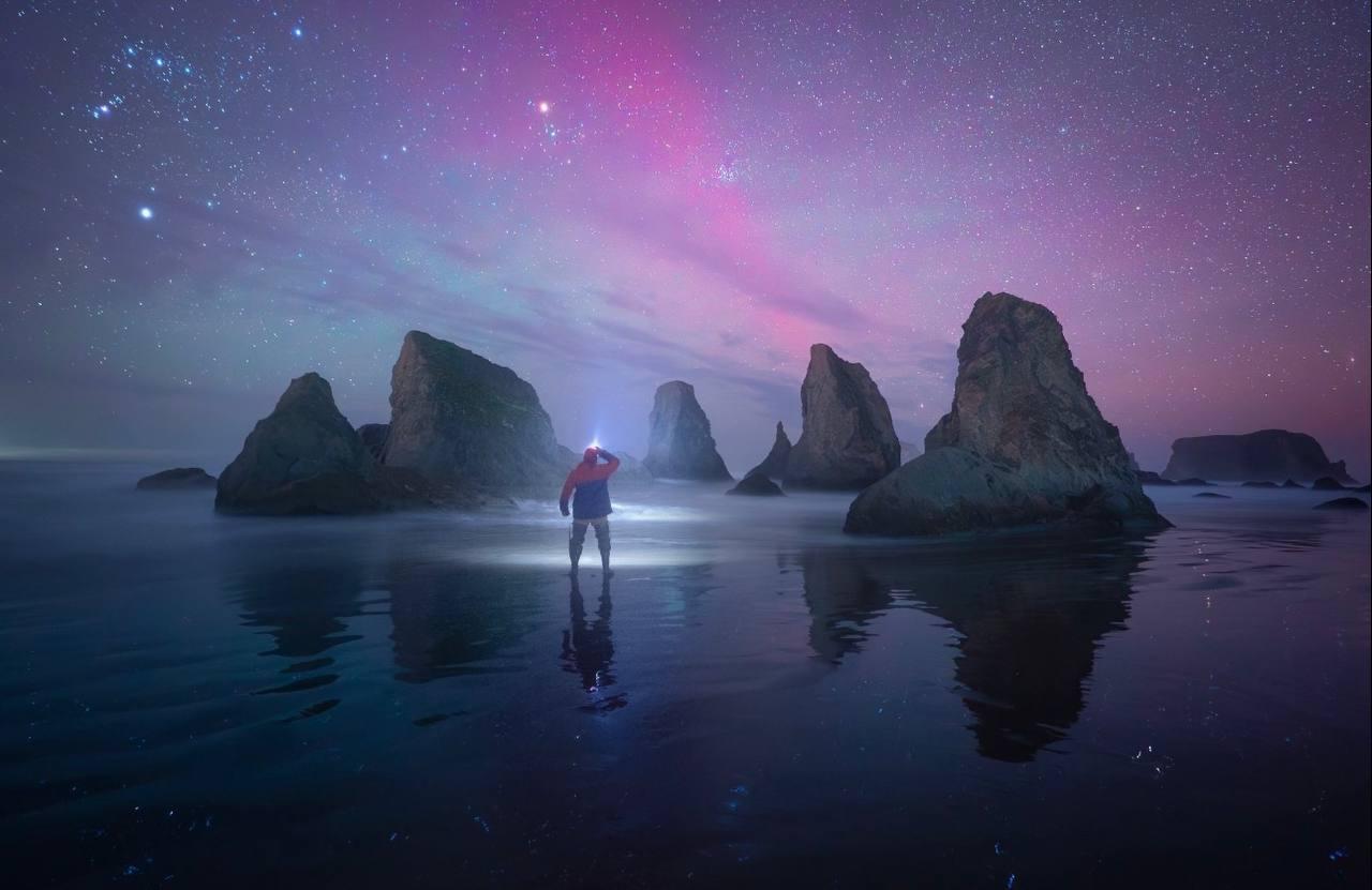 Фотограф запечатлел над пляжем Бандон полярное сияние розового цвета - редчайшее явление, требующее особого состояния атмосферы.