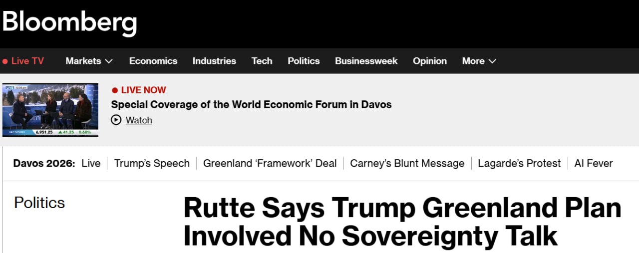 Bloomberg: Глава НАТО заявил, что прорыв в вопросе Гренландии был достигнут без обсуждения суверенитета этой территории с президентом Дональдом Трампом.