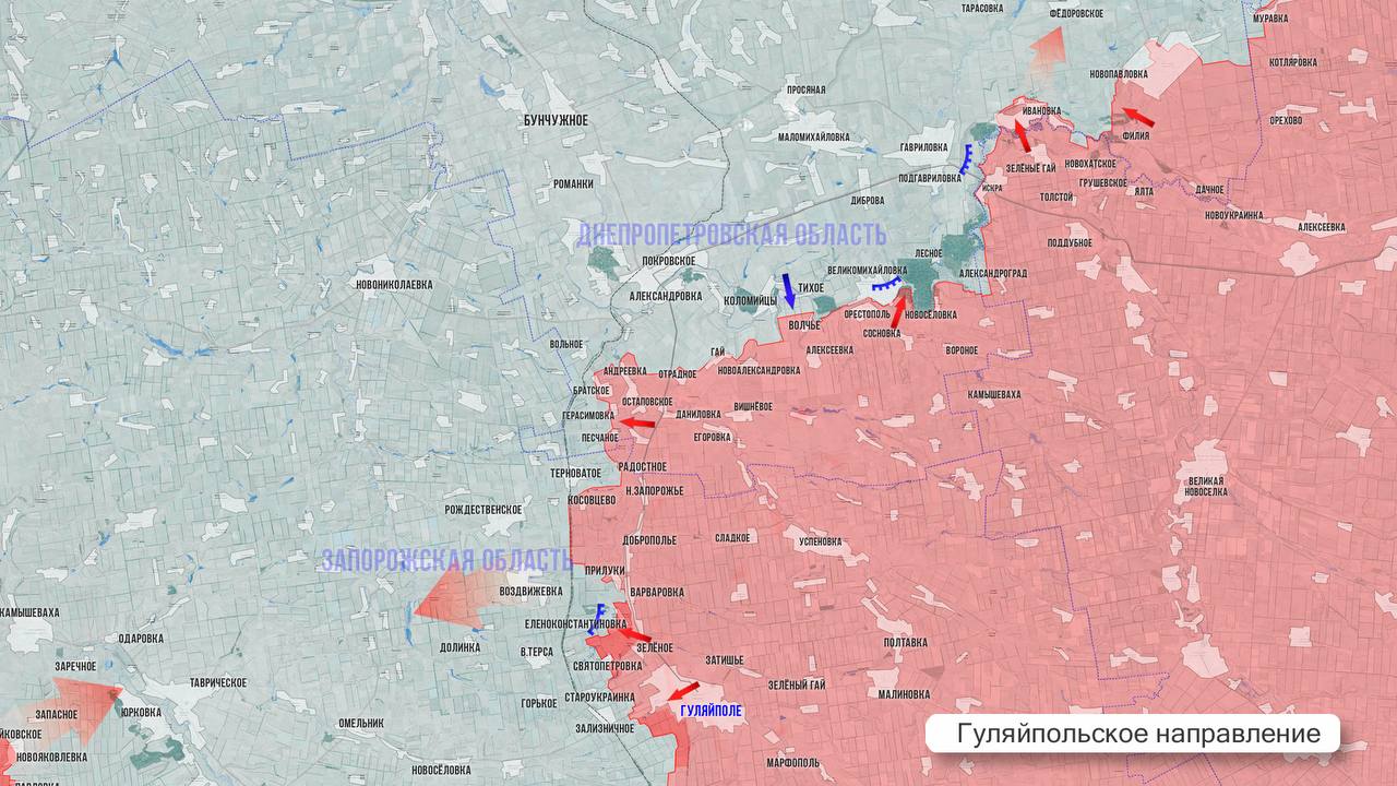 На Гуляйпольском направлении ВС РФ отразили 7 контратак ВСУ и уничтожили 2 танка, не считая другой техники. Вдоль западного берега р. Гайчур наши части по всей ширине фронта стараются вклиниться в оборону ВСУ. Упорные бои идут на подступах к Терноватому.