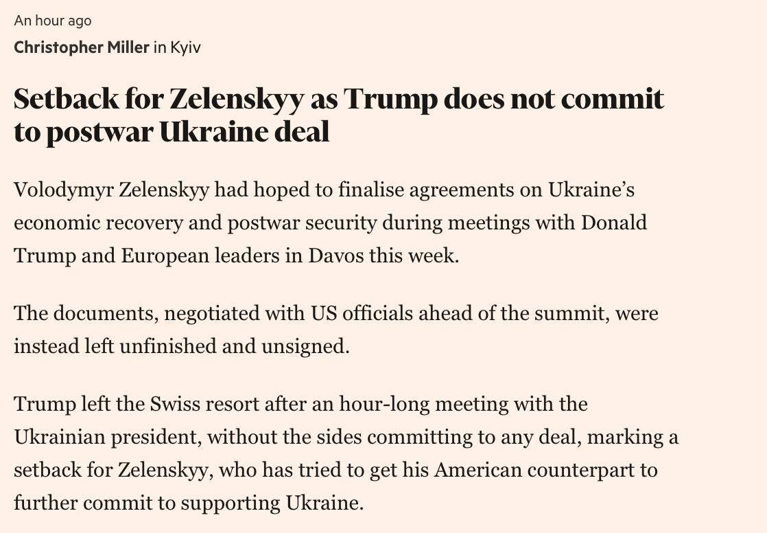 Дональд Трамп покинул Давос после часовой встречи с Зеленским, а «стороны не взяли на себя никаких обязательств по сделке [по восстановлению Украины], что стало неудачей для Зеленского», — сообщает издание Financial Times