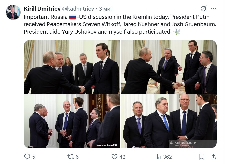 "Президент Путин принял миротворцев Стивена Уиткоффа, Джареда Кушнера и Джоша Грюнбаума", — написал Дмитриев в соцсетях. IZ RU в...