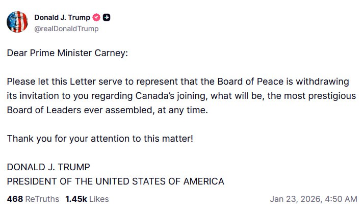 "Уважаемый премьер-министр Карни: пожалуйста, пусть это письмо послужит представлением о том, что Совет мира отзывает свое приглашение к вам относительно присоединения Канады в самый престижный Совет лидеров, когда-либо собранный за все времена", — написал президент США в соцсетях.