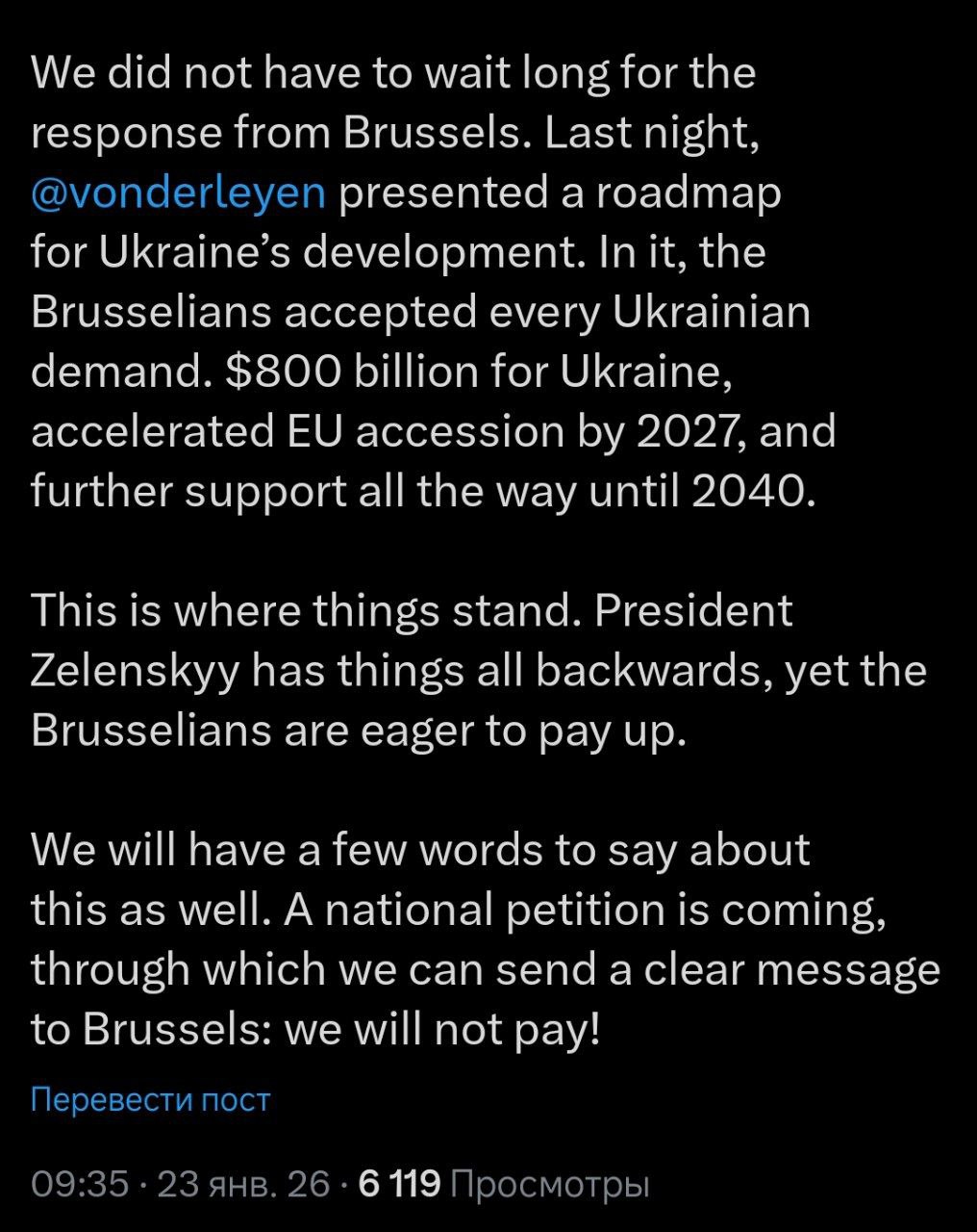Мы тоже скажем об этом несколько слов. Скоро будет национальная петиция, с помощью которой мы сможем ясно дать понять Брюсселю: мы платить не будем!»