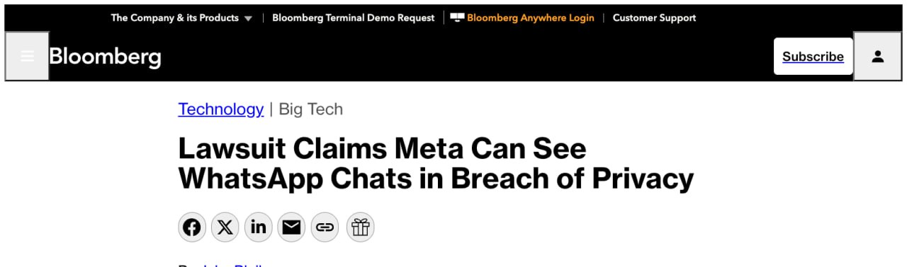 Bloomberg сообщает, что против Meta Platforms, Inc* и WhatsApp подан международный иск. Компанию обвиняют в том, что она вводила пользователей в заблуждение, утверждая, будто вся переписка в мессенджере является конфиденциальной.