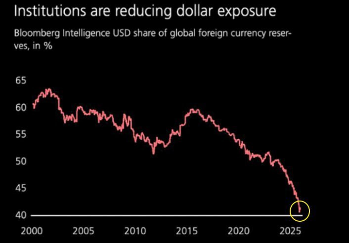 Дедолларизация продолжается. Доля доллара в резервах глобальных институционалов (включая Центробанки мира) упала до самого низкого уровня за это столетие. @banksta