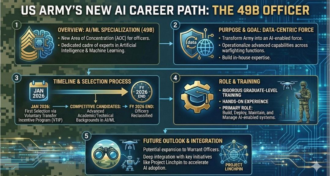 ИИ в армии становится штатной компетенцией. Пока, правда, не в нашей. Армия США официально ввела новую военную специальность — офицер по искусственному интеллекту и машинному обучению под кодом 49B. Отобранные специалисты пройдут обучение на магистерском уровне.