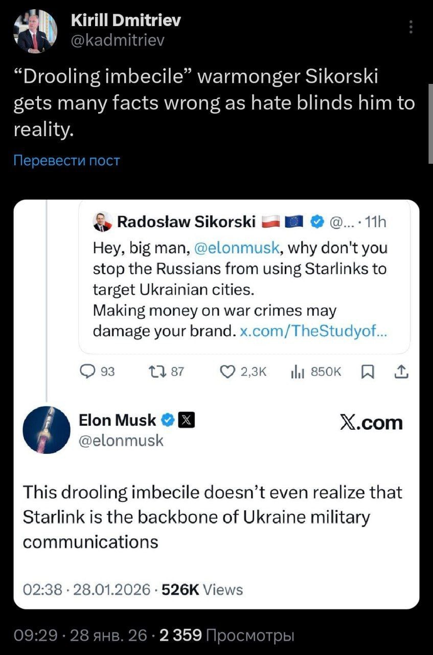 «"Слюнявый идиот" и поджигатель войны Сикорский допускает множество ошибок в фактах, поскольку ненависть ослепляет его и не позволяет увидеть реальность» — спецпредставитель президента, глава РФПИ Кирилл Дмитриев.