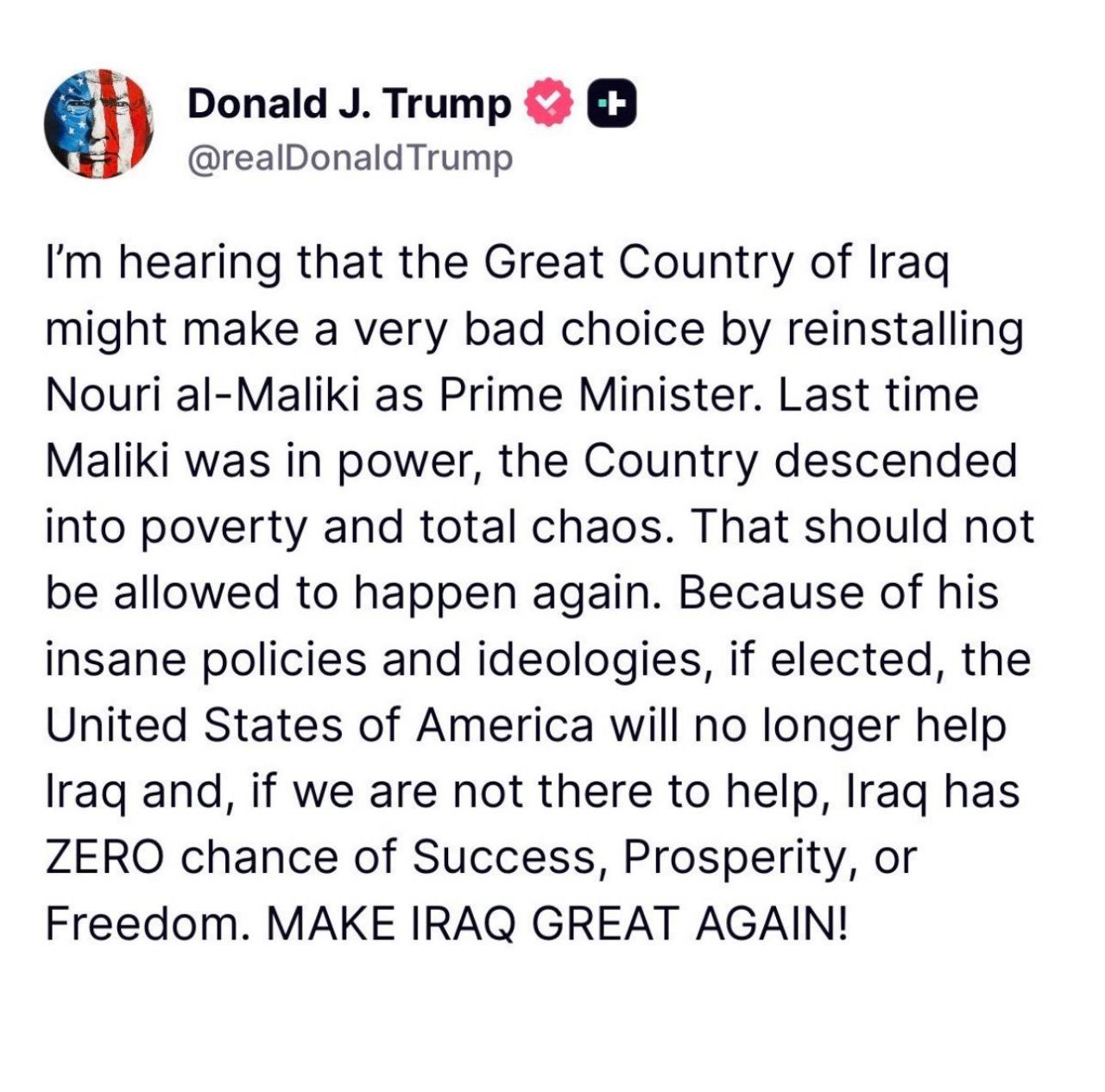 Трамп пригрозил прекратить поддержку Ирака, если аль-Малики займет пост президента «из-за его безумной политики и идеологий».