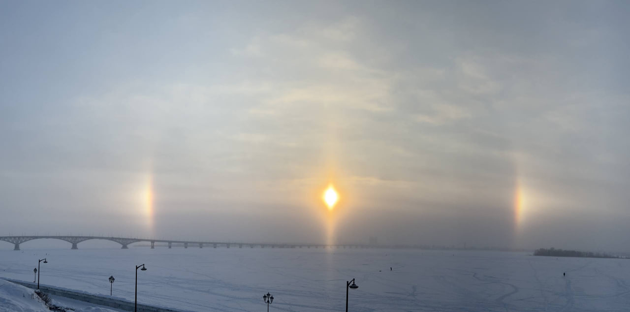 Вот такой эффект гало с двумя "ложными солнцами" наблюдали сегодня утром жители Саратова.